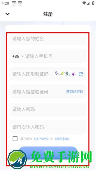 3、在注册页面,填写信息,勾选协议后点击注册,完成账号注册。