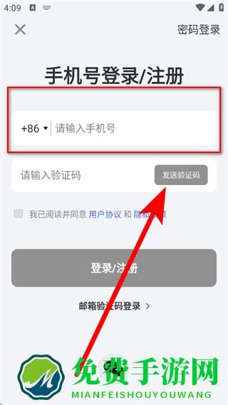 3、在登录注册页面,输入手机号后,点击发送验证码。