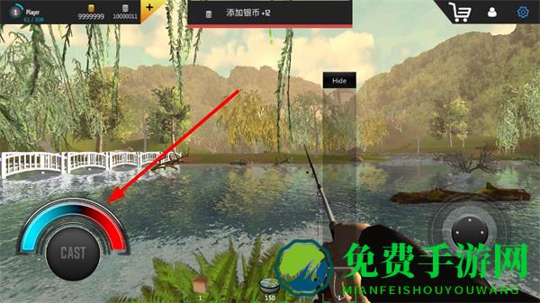 2、点击抛投按钮将钓饵抛入水中,抛投时需关注力度条,控制抛投距离与精度,力度适中可让钓饵落入理想钓点。