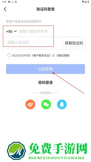 3、输入短信手机号、验证码后,点击立即登录即可。