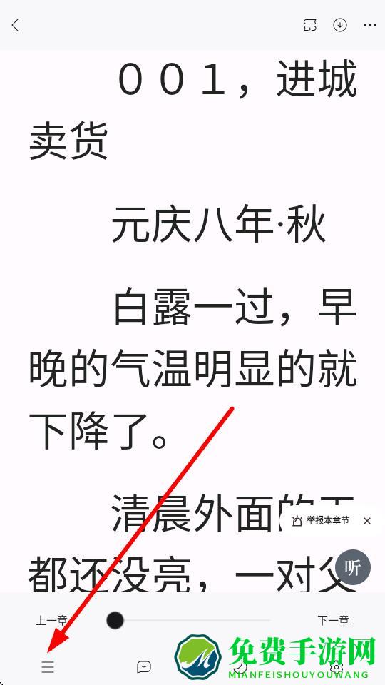 2、在小说阅读界面,点击左下角三条横线样式的按钮弹出目录。