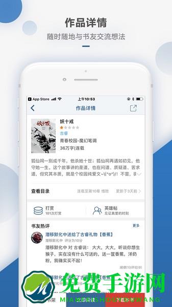 高人气互动社区,众多知名作家定期做客,时时开贴与粉丝互动,还有各类小说大触倾心吐槽,快速求书、自由评论畅聊书海,以文会友。