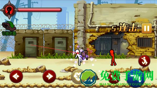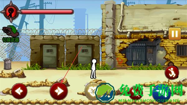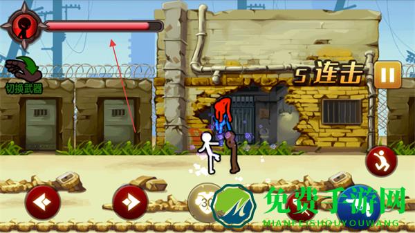 1、使用左下角的方向键左右箭头操控火柴人移动,在场景中探索,准备与敌人战斗。