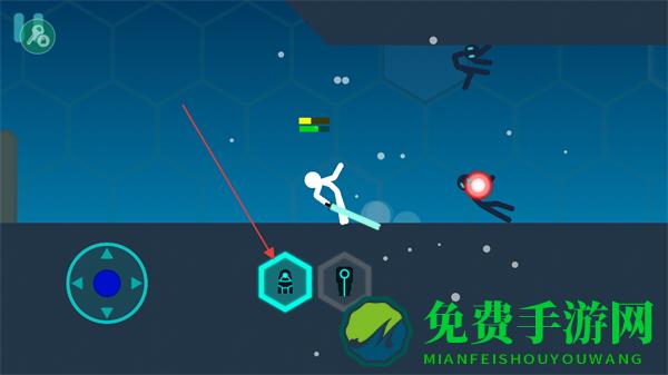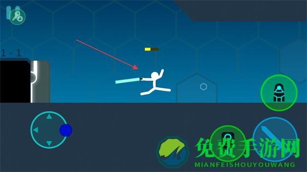 2、点击右侧剑形按钮,让火柴人挥舞长剑攻击敌人,可进行跳跃攻击等动作。