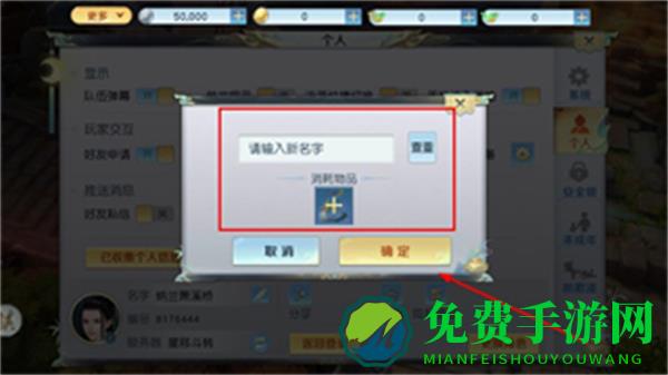 3、在改名界面输入新名字,点击确定,消耗相应物品后即可完成名字修改。
