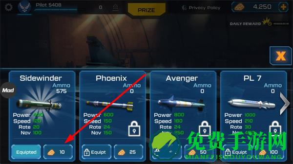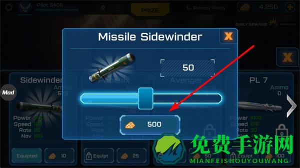 2、在武器选择界面中,挑选想要购买的导弹,如Sidewinder导弹,点击其下方的购买按钮。