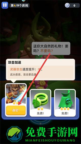 3、在房间中会遇到自然精灵赠送礼物的情况,需根据自身需求选择,如选择攻击加速类奖励可提升武器攻击速度。