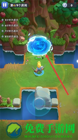 4、通关房间后会出现蓝色传送门,进入可前往下一个房间继续挑战,在规定时间内通关可获取更高星级奖励。