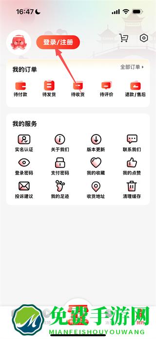 2、在个人页面,点击登录注册按钮,进入登录页面。