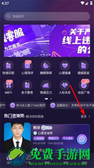1、在首页,点击热门咨询师右侧的更多选项,进入咨询师列表页面。