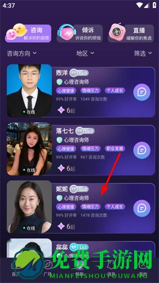 2、在咨询师列表页面,选择目标咨询师如妮妮,进入该咨询师的详情页面。