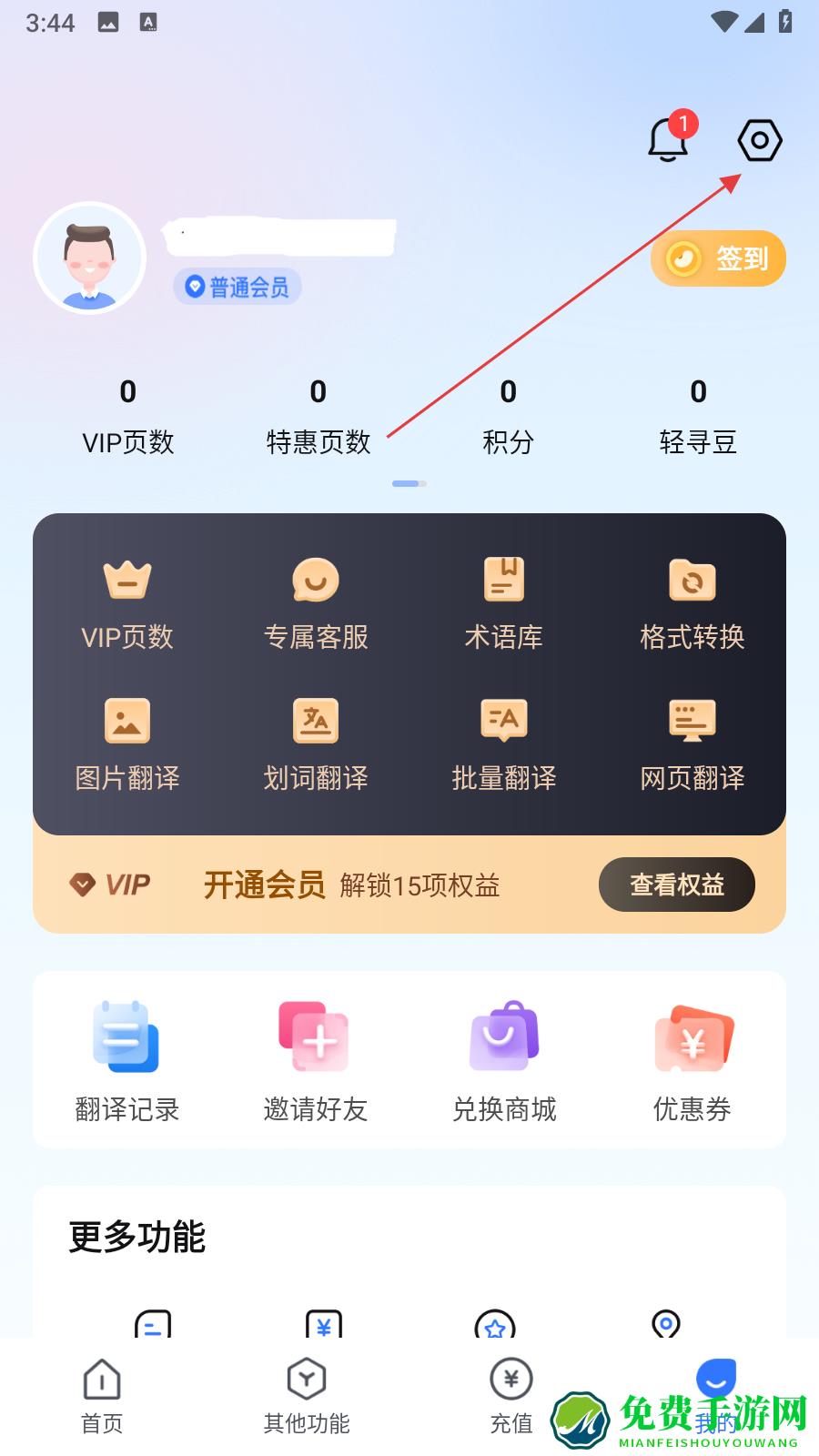 1、打开翻译狗APP,在个人页面中,点击右上角的设置图标,进入设置界面。