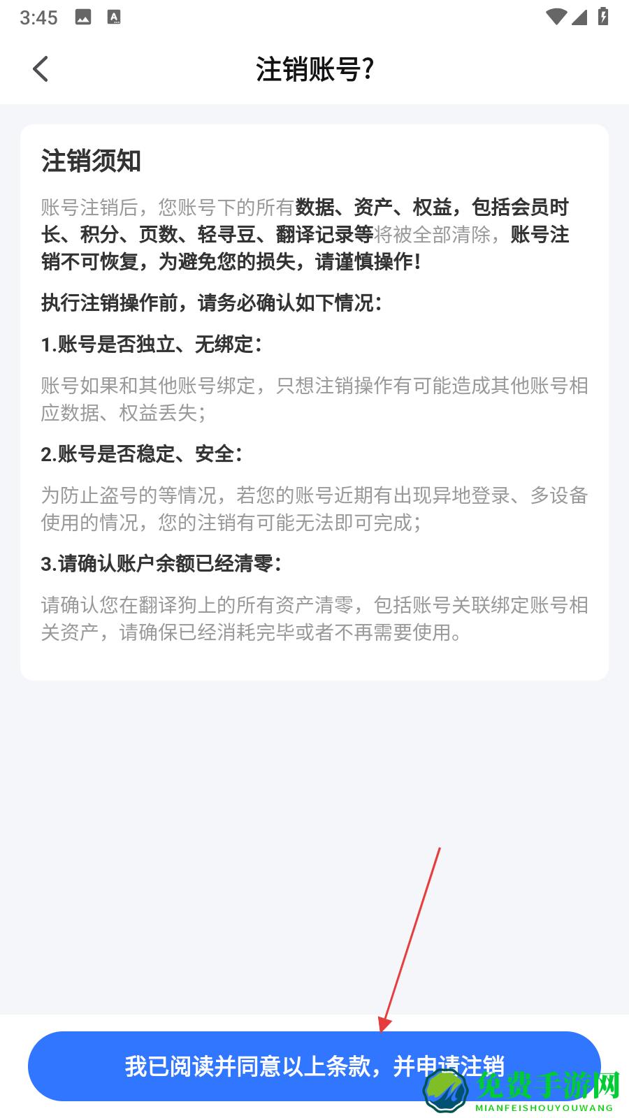 3、在注销账号须知页面,点击我已阅读并同意以上条款,并申请注销按钮。