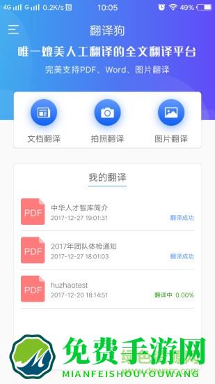 翻译狗app是一款专业的文章翻译软件,在线翻译文档速度快且结果精准,能完整保留Word、PDF等原文的排版样式,避免格式混乱,支持拍照翻译功能,遇到纸质文档或外文标识时,拍一拍就能快速识别翻译,是提升学习效率、处理外文工作的实用帮手,有需要可前往免费手游网下载。