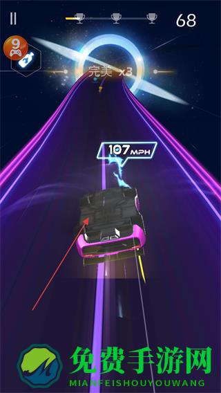 采用移动点击的核心操作,通过滑动屏幕控制赛车转向、躲避障碍,操作逻辑简单直观,无需复杂按键组合,新手也能快速跟上音乐节奏完成竞速。