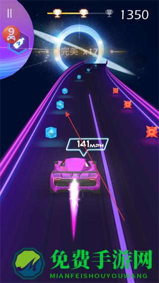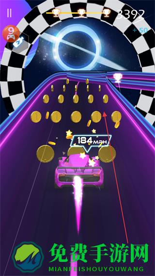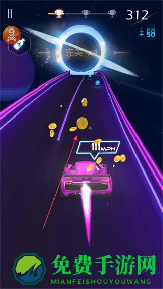1、在充满霓虹特效的赛道上驾驶赛车,通过左右移动赛车来躲避障碍物、收集金币和蓝色宝石等资源。