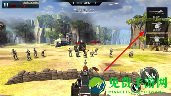 2、右侧可切换轻机枪、重机枪、火箭炮等武器,轻机枪适合应对步兵,需根据敌人类型灵活切换。