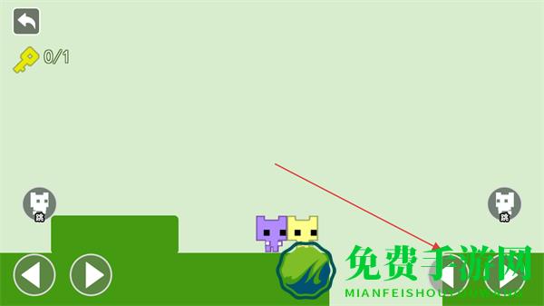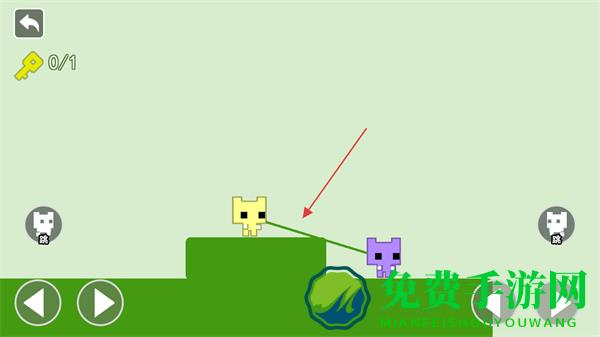 2、当遇到高低差地形时,控制其中一个角色移动,带动另一个角色越过障碍,如让黄色角色先下台阶,紫色角色随之移动。