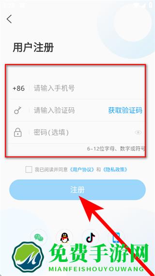 4、在注册页面输入手机号、验证码,选填密码,勾选后,点击注册。