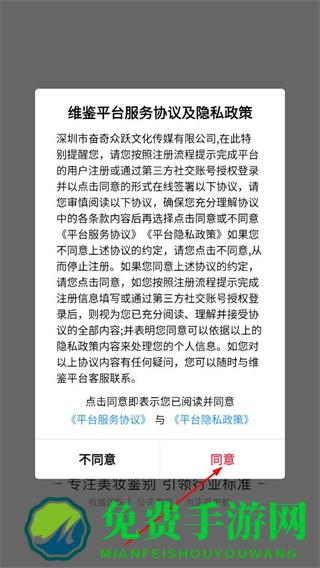 1、在维鉴的服务协议及隐私政策弹窗中,点击同意,进入首页。