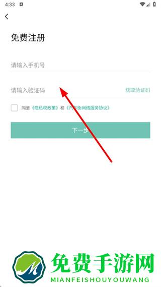 4、在免费注册页面输入手机号,获取并输入验证码,勾选同意协议后点击下一步,即可完成账号注册。