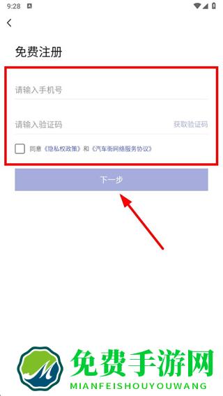 4、在免费注册页面,输入手机号、获取并填写验证码,勾选协议后点击下一步,即可完成汽车街账号的注册。