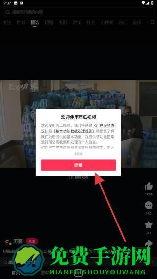 1、打开西瓜视频APP,进入首页内会弹出欢迎使用西瓜视频的温馨提示,点击同意的按钮。