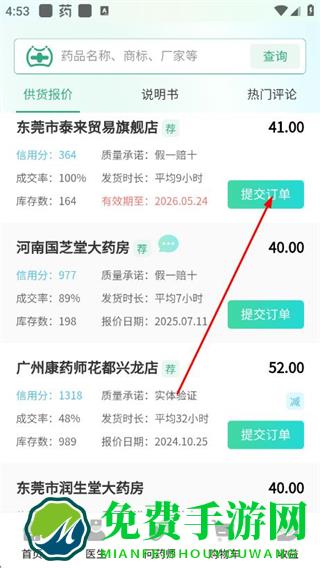 2、在供货报价页面选择目标商家,点击对应的提交订单,进入订购药品页面。