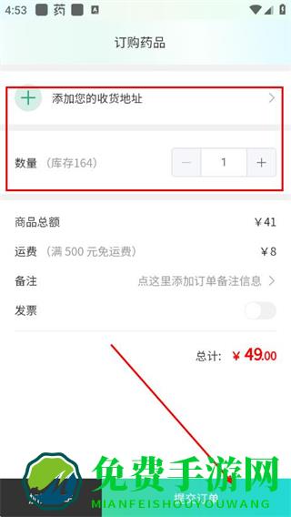 3、在订购药品页面,添加收货地址、选择购买数量后,点击提交订单。