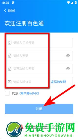 4、在注册页面,输入手机号、密码、确认密码、验证码,勾选协议后,点击注册,完成注册操作。