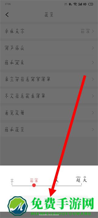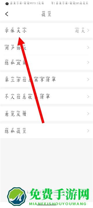 2、在设置页面,选择字体大小,进入弹窗页面。