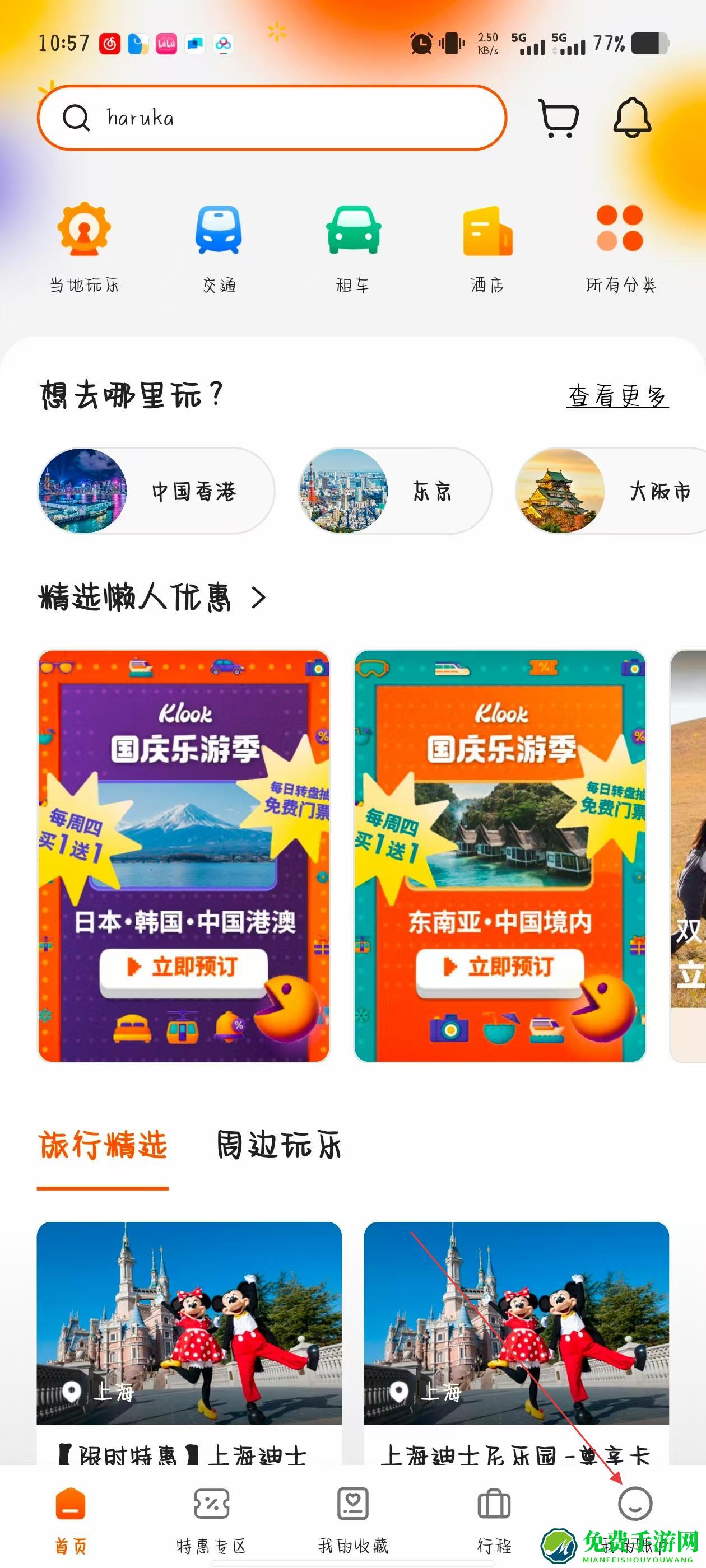 1、打开KLOOK客路旅行APP,点击页面右下角我的图标,进入个人中心页面。