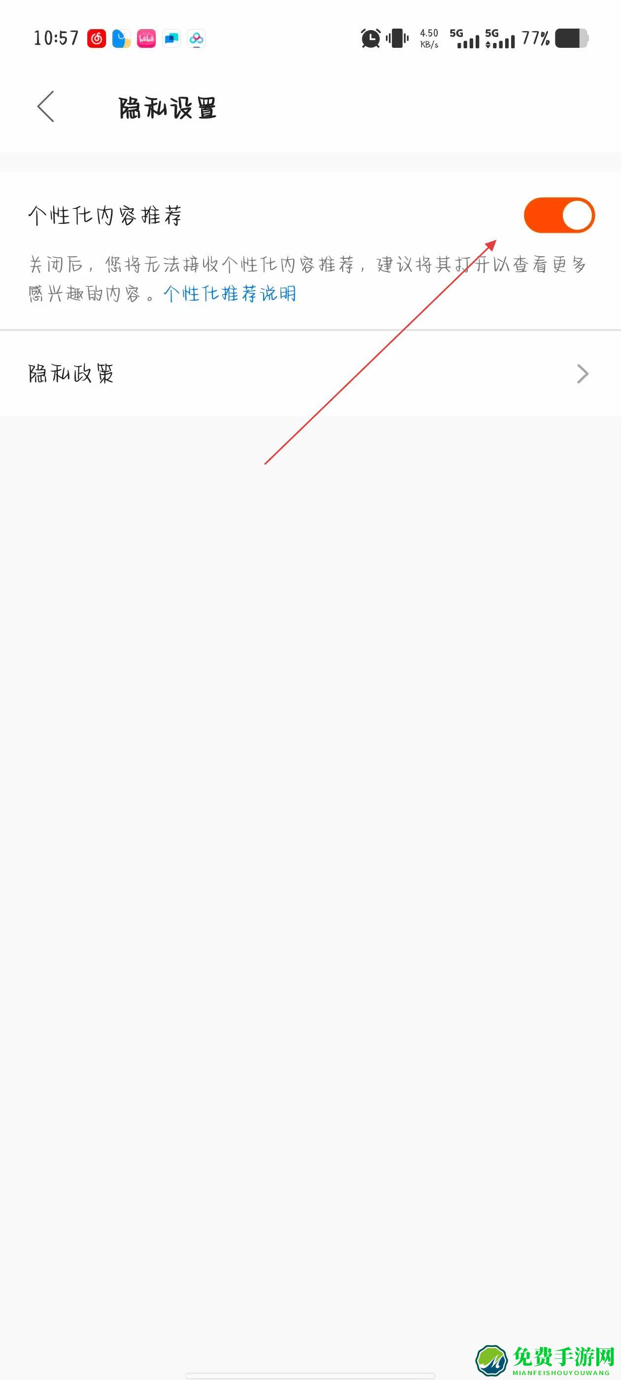 4、在隐私与个性化页面中,找到个性化推荐相关的开关按钮,点击开关将其切换为关闭状态。