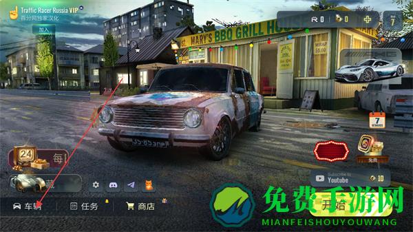 1、在俄罗斯乡村赛车手主界面,点击车辆进入车辆选择界面,也可点击开始进入模式选择环节,同时可借助界面功能按钮辅助操作。