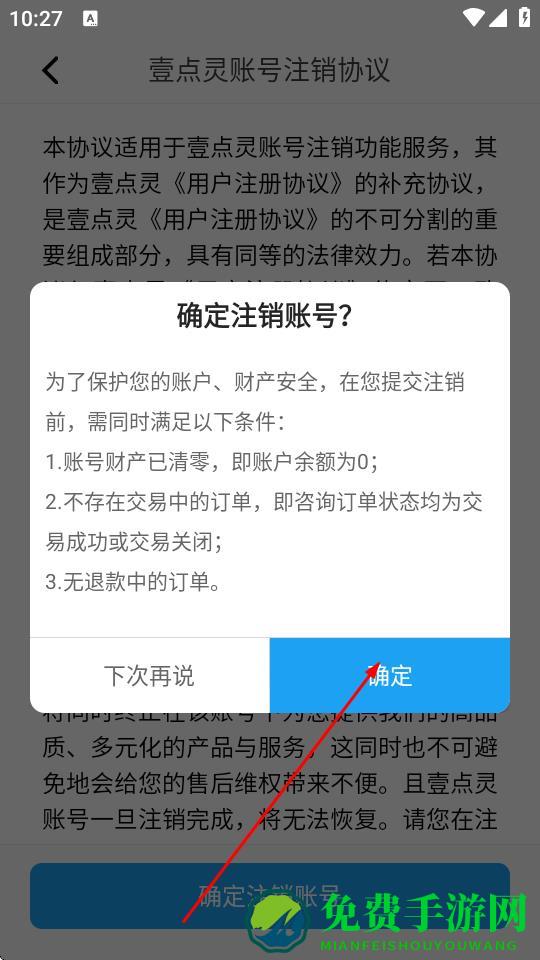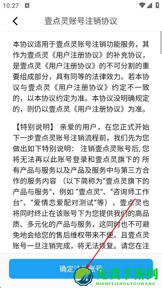 5、在壹点灵账号注销协议页面,仔细阅读协议内容,点击确定注销账号。