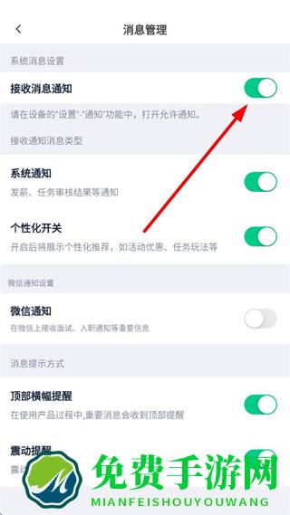 4、在消息管理页面将接收消息通知功能的开关关闭,即可关闭消息通知。