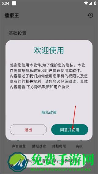 1、打开播报王软件,在弹出的欢迎使用弹窗中,点击同意并使用按钮进入主界面。