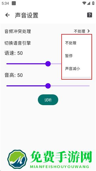 4、在音频冲突处理的选择弹窗里,可选择不处理暂停声音减小等对应选项完成设置。