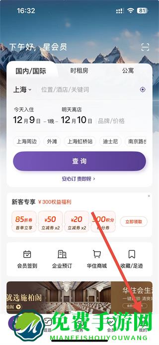 1、打开华住会App在主界面选择国内/国际等类型,并选择入住城市如上海,设定入住及离店日期后点击查询。