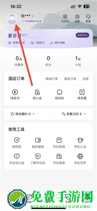 1、在华住会app界面底部,点击我的选项,进入我的个人页面。