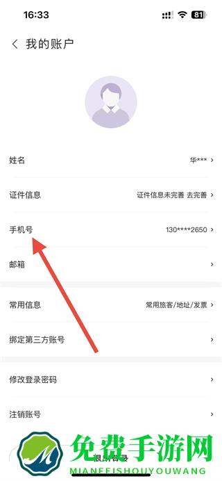 3、在我的账户页面中,找到手机号选项并点击,进入更改手机号的验证页面。