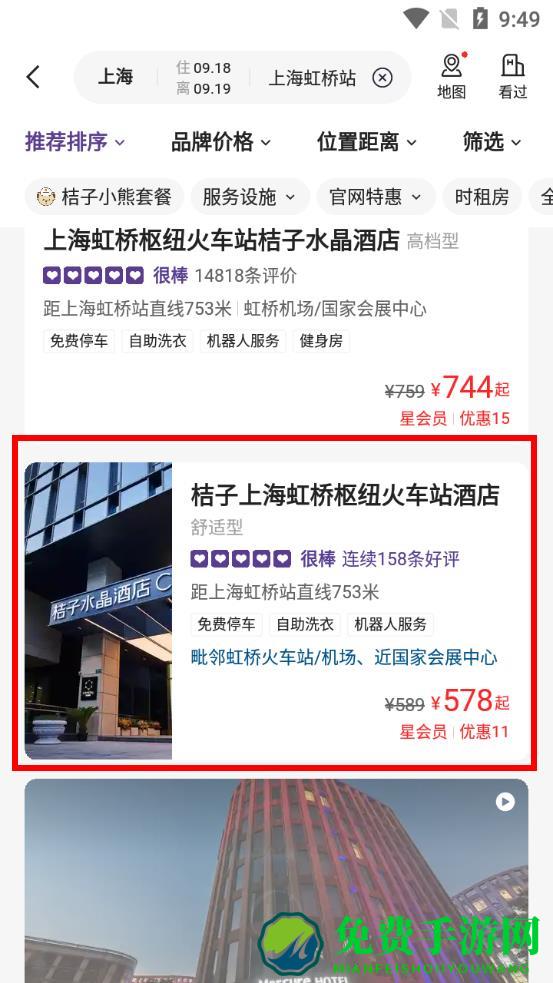 2、在查询结果中找到心仪酒店,比如桔子上海虹桥枢纽火车站酒店并点击进入。