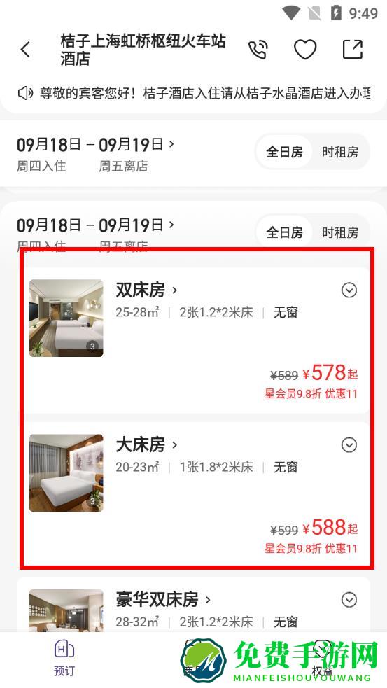 3、进入酒店页面后浏览房型如双床房、大床房等,选择合适房型。