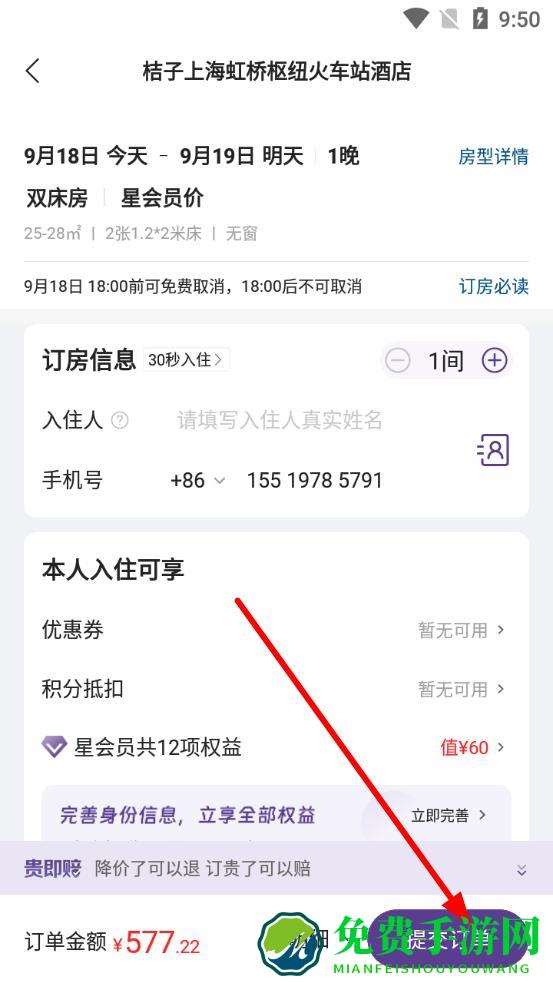 4、填写订房信息包括入住人姓名、手机号等,确认订单金额后点击提交订单完成预订。