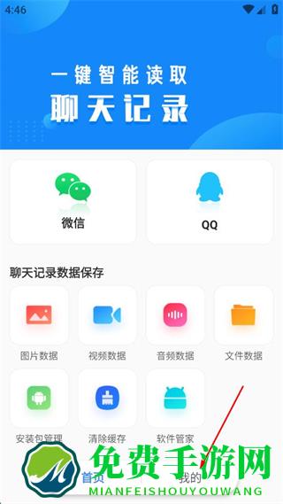 1、打开聊天记录读取软件的首页,找到页面下方的我的选项,点击进入对应的个人页面。
