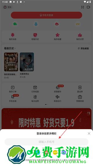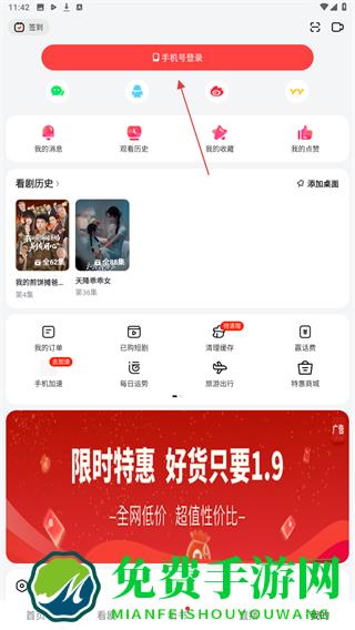 2、进入我的界面内,点击上方手机号登录的按钮。
