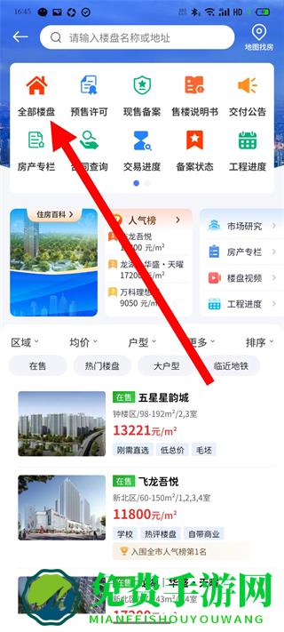 2、在新房页面,点击全部楼盘,查看所有楼盘列表。