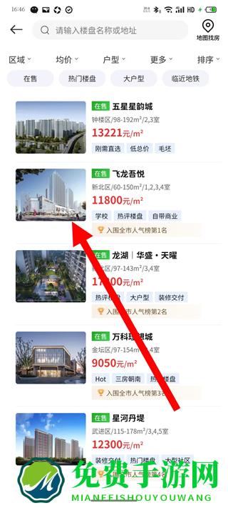 3、在楼盘列表中,点击选择目标房源,进入房源详情页。