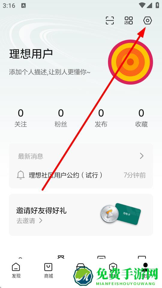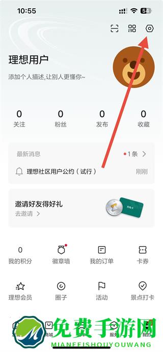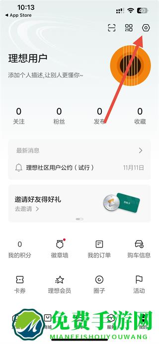 1、打开理想汽车app,在我的页面点击右上角设置图标,进入设置页面。