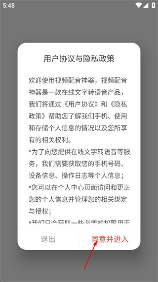 1、打开视频配音神器软件,查看弹出的用户协议与隐私政策,点击同意并进入按钮。